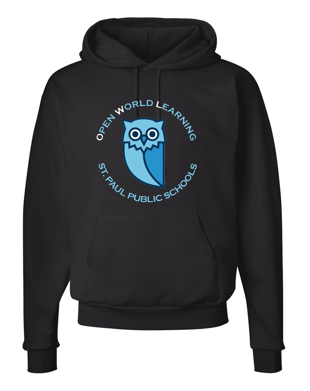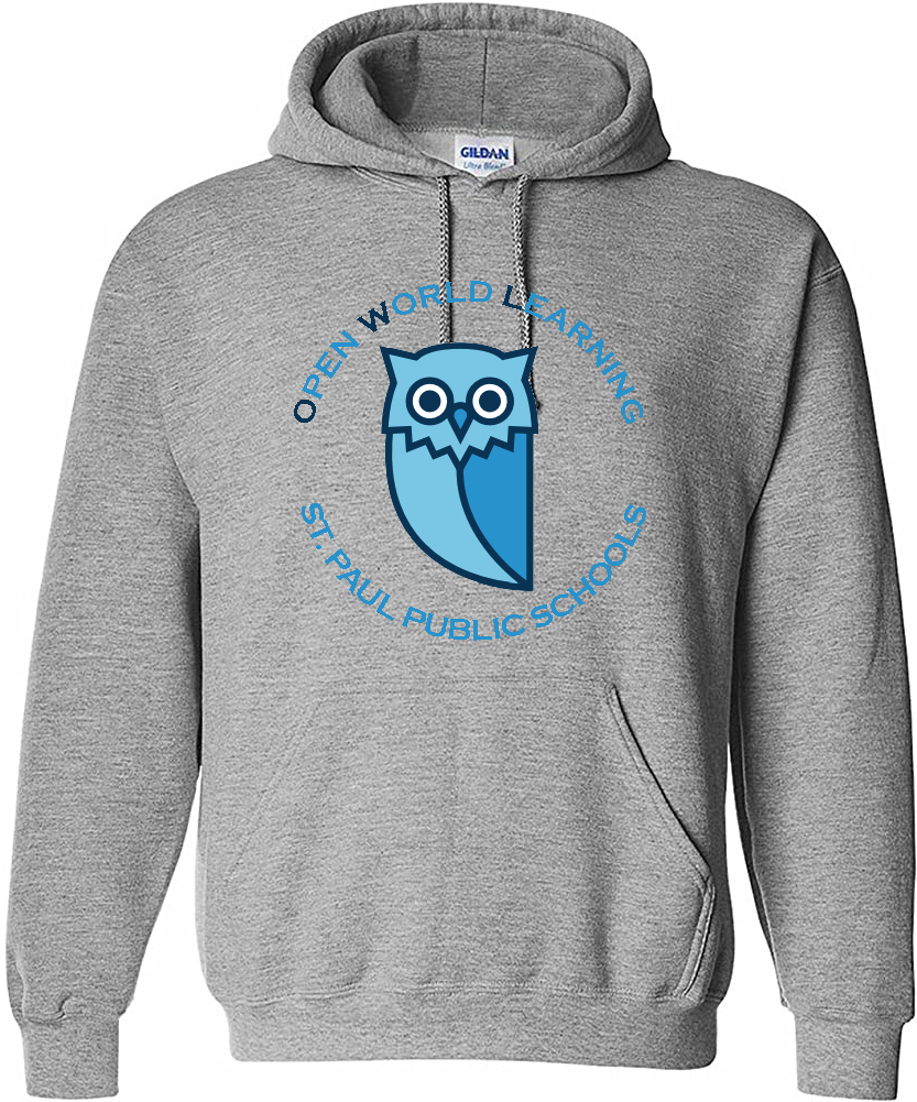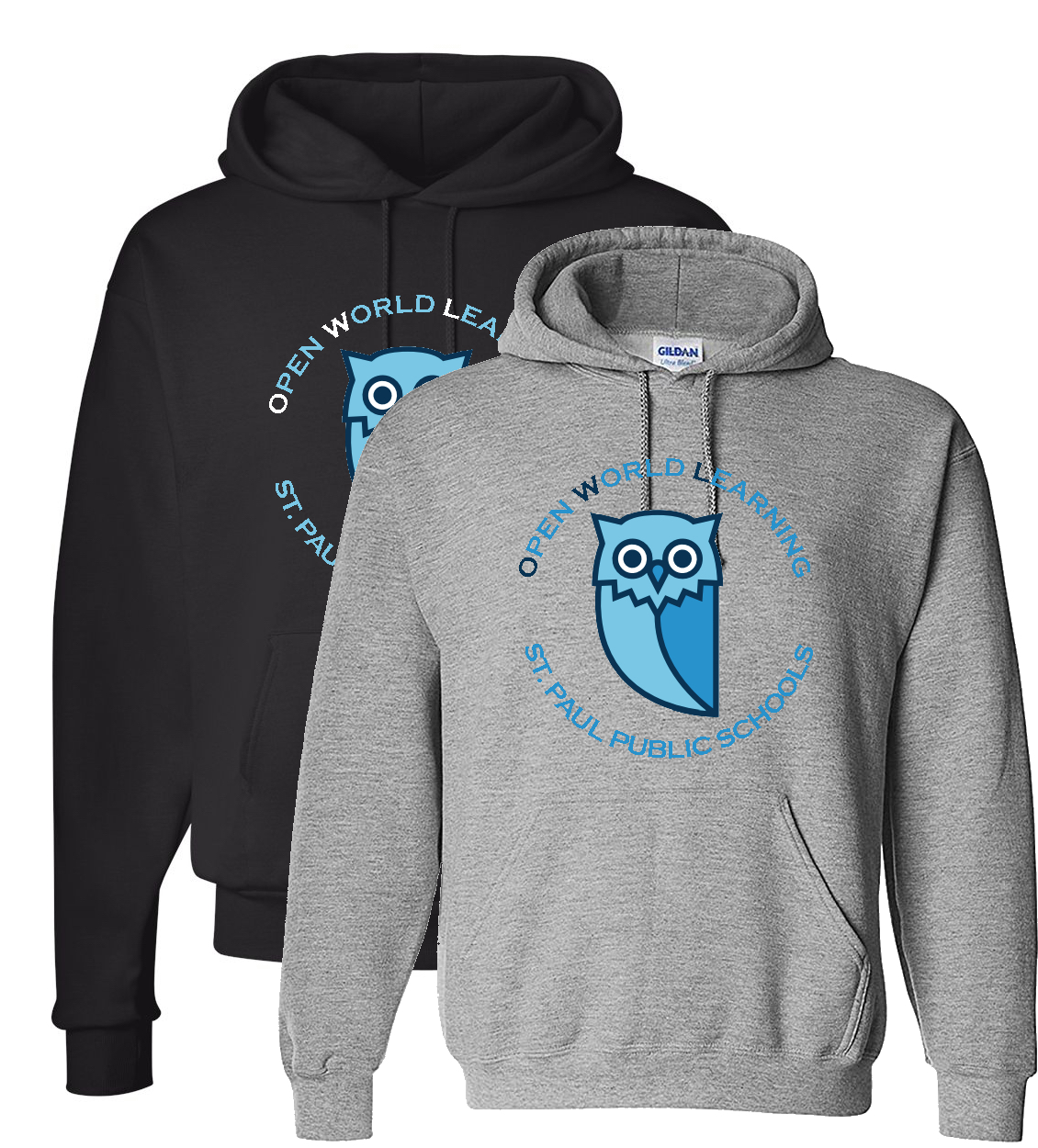 Owl logo surrounded by the words “Open World Learning” / “St. Paul Public Schools”. Color logo screen printed on either gray or black hoodie.