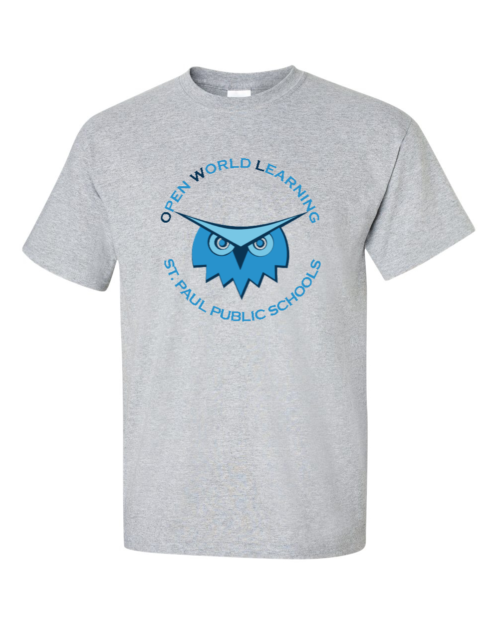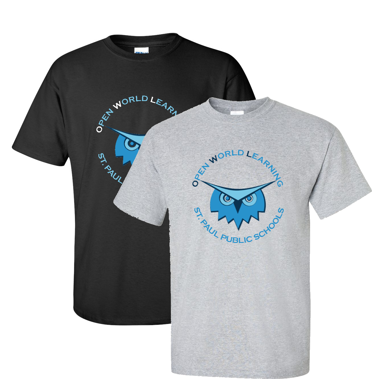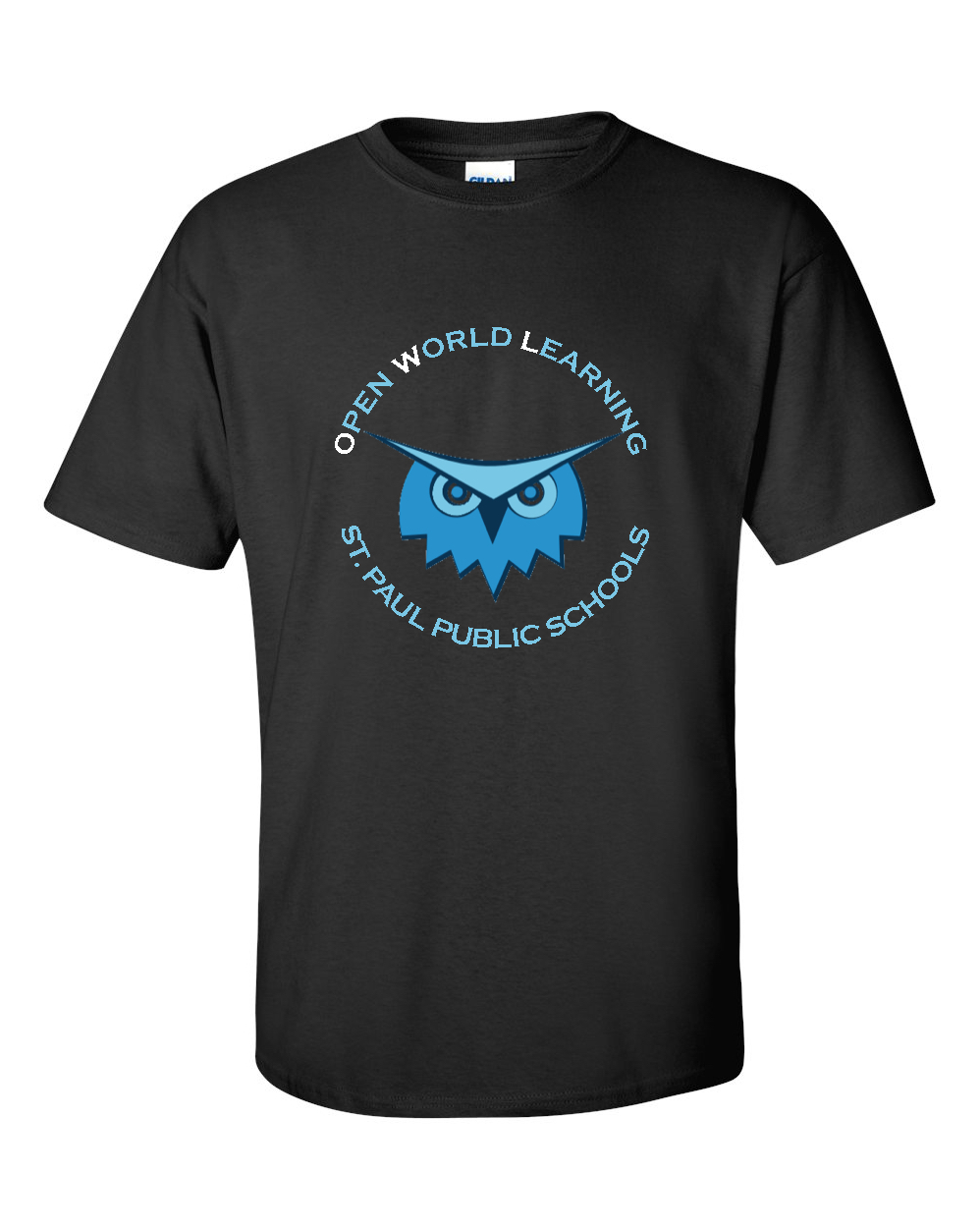 “Fierce Owl” logo surrounded by the words “Open World Learning” / “St. Paul Public Schools”. Color logo screen printed on either gray or black t-shirt.