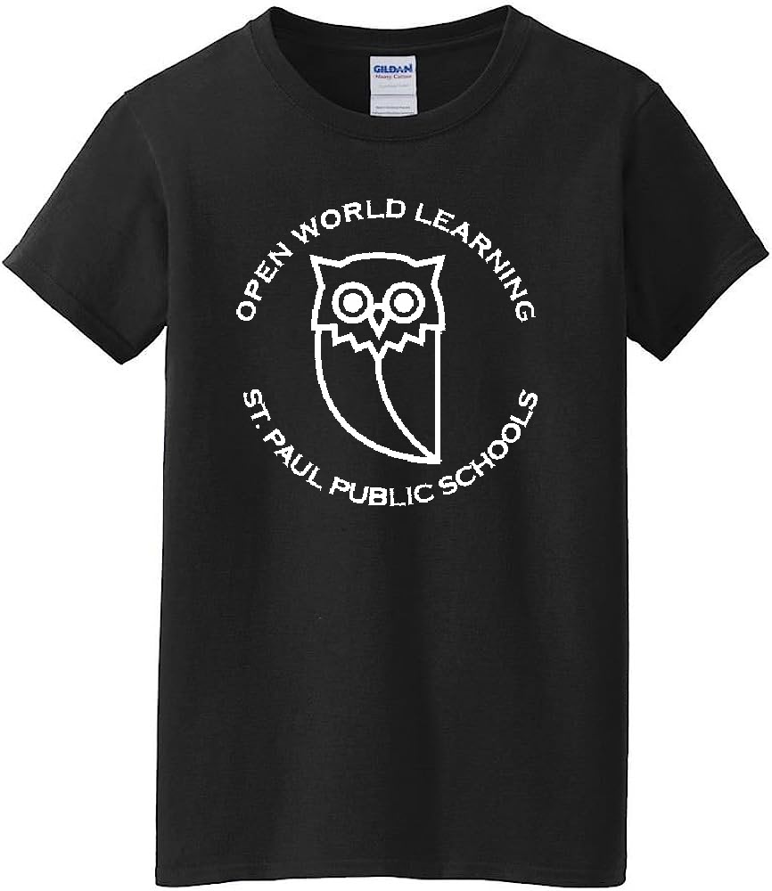 Owl logo on surrounded by the words “Open World Learning” / “St. Paul Public Schools”. White logo screen printed on black t-shirt.