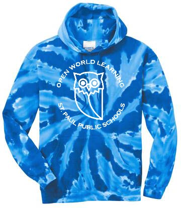 Owl logo on surrounded by the words “Open World Learning” / “St. Paul Public Schools”. White logo screen printed on blue tie-dye hoodie.