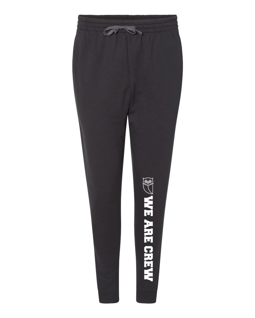Black joggers by Jerzees with the owl and “We Are Crew” written down the leg. Unisex adult sizing.